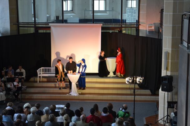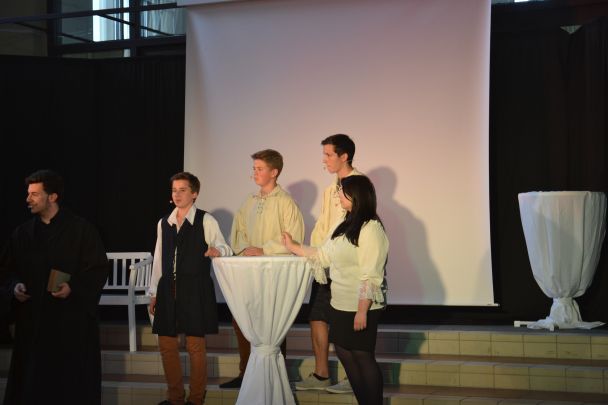 Als Schüler unseres Gymnasiums vorschlugen, einen Teil des Erlöses des Joe-Polowsky-Gedächtnislaufes am 27. Juni 2014 für das Kinderhospiz Bärenherz in Leipzig zu spenden, waren wir von dieser Intention so angetan, dass wir uns als Theatergruppe sofort entschlossen, jenes Anliegen tatkräftig mit einer Benefiz-Veranstaltung zu unterstützen. In dem vergangenen Jahr konnten wir viele Gäste unserer Theateraufführungen „LUTHER in MIR“ im Kulturhaus und in der Schlosskirche begrüßen. In beiden Vorstellungen gelang es den Jugendlichen, durch das Ineinander-Greifen, Verknüpfen und Vernetzen der künstlerischen Ensembles Schauspiel, Solisten, Chor, Orchester und Band der Inszenierung in hohem Maße Kraft und Ausdrucksstärke zu verleihen und diese Abende zu einem besonderen Erlebnis werden zu lassen. All dies liegt 1 Jahr zurück. In dieser Zeit haben Schüler der Klasse 12 aus den Aufnahmen der Theatervorstellungen, Interviews mit den Protagonisten und Statements differenziertester Unterstützer unserer Idee die Homepage „luther-in-mir.de“ erstellt, die in brillanter Art und Weise das Thema präsentiert. Unser Martinus Luther, alias Tariq Ali, absolvierte nunmehr seine Abiturprüfungen. Er spielte für uns noch einmal die Rolle des Luther. Die ehemaligen Studenten der Reformation sind zu realistischen Studenten des 21. Jahrhunderts avanciert. Ihre Rollen sowie die der Bauern haben andere Schüler gern übernommen. Die einstigen Kinder Luthers sind nicht wirklich mehr Kinder, auch hier handelten jüngere Schauspieler. Sowohl in der Pantomime-Sequenz als auch in der Hip-Hop-Gruppe agierten andere Schüler mit Leidenschaft und hohem Engagement. Die Inszenierung vermittelte so eine individuelle Interpretation des Sujets, von anderen Persönlichkeiten kreativ und facettenreich geprägt. Der Erlös der Benefiz-Veranstaltung beträgt 500,00 Euro. Wir möchten uns hierfür sehr herzlich bei allen unseren Spendern bedanken. Dr. Gabriele Hönicke Fachleiterin Johann-Walter-Gymnasium Torgau |